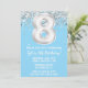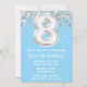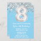 Light blue and silver8th birthday party invitation age 8 birthday party invitation with glitter and modern script writing and fun foil balloons.