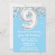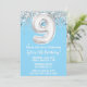 Light blue and silver 9th Birthday party invitation age 9 birthday invitation with black white silver with modern script writing and fun foil balloons.