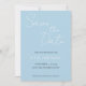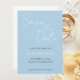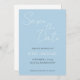 Simple style wedding save-the-date invitations that feature black, stylised script on a trendy, light blue colour background. Edit and replace names, date, and location with your own. Select your invitation size and paper style.