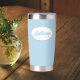 Gift your wedding groomsman with this personalised, stainless steel, thermal tumbler with his name in stylised script in a white oval design. Background and script is a trendy, light blue colour. Personalise your thermal tumbler by editing and replacing groomsman's name with desired name.