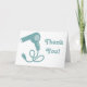 This card features a hand-drawn style illustration of a vintage hairdryer in light blue and the message "Thank You" in matching retro lettering. The message inside is ready for your custom touch.