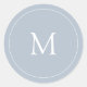 This simple and modern wedding sticker features a trendy, light dusty blue background with your initial in elegant white text, and a matching white circular frame. It is made to coordinate perfectly with our "subtle watercolor roses" wedding collection.
