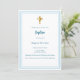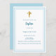 A white background, decorated with a light blue frame, and a golden cross Personalise and add the name and details. White text.