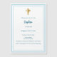A white background, decorated with a light blue frame, and a golden cross Personalise and add the name and details. White text.