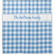 Add a classic accent to your bathroom with a custom shower curtain featuring light blue, white, and pale blue squares in a bold buffalo plaid with your family name in a rustic script font within a white band near the top. Add your own surname or text in the sidebar.