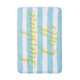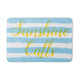 Sunshine Calls is written in bright sunny yellow. Pretty light blue and white horizontal striped pattern. Cool trendy bathmat pattern with a beach vibe for the warmer spring and summer months for decor fun. Original designs © TamiraZDesigns