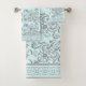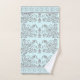 Beautiful towel set in light blue background with soft grey flourishes. Perfect for gifting, guest baths and more.