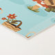 Light blue wrapping paper featuring a repeated pattern of whimsical cartoon gnomes with instruments, gifts, and trees, evokes a festive and playful mood.