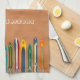 Add some winter fun to your kitchen with this personalized towel. Your name (or other custom text) is in cream lettering against a light brown background that mimics the look of the wood siding on ski lodge. The ends of this towel are adorned with my illustrations of vintage skis in bright colors of yellow, red, orange, green, blue and cream.