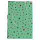Holiday re-useable gift bag, in light green, covered with colourful jingle bells and snow, and the Christmas carol "Jingle Bells" on the front.