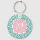 A white outlined quatrefoil pattern is on a light, almost sea foam green background. The centre has a customisable light, powder pink monogram frame that compliments the green colour prettily.