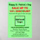 Light green poster for St. Patrick's Day that you can customise by specifying the discount percentage, sale dates, uploading your business logo, typing your business name, address, phone number, email and website. Customise it and display it to attract more customers to buy your products or clients to like your services. Please check the appearance after uploading logo and typing texts. If the appearance is pleasing to you, you can place your order now. If you need to resize and reposition the logo and texts to fit on this poster or on the size and style that you've chosen, please adjust in the design tool. You can also change the background colour, font colour and font style in the design tool. Happy St. Patrick's Day! Wishing you the best of luck, joy and more sales this holiday.