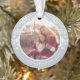 Festive Christmas photo ornament features a favourite photo on each side, encircled by a holiday sweater pattern in light neutral grey and white. Personalise with your custom caption; shown with your family name and the year.