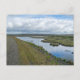 A compelling landscape shot showcasing the quiet majesty of a reservoir. The scene is framed by a rustic railing, leading the eye across a winding stream feeding into the larger body of water. Under a captivating cloudy sky, distant power pylons add a unique industrial-meets-nature aesthetic. This image evokes feelings of contemplation and the subtle power of both natural and man-made structures coexisting. Ideal for anyone seeking a distinctive, thought-provoking natural scene with a touch of modern presence. This image can be edited and transferred to multiple products of your choosing.
