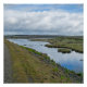 A compelling landscape shot showcasing the quiet majesty of a reservoir. The scene is framed by a rustic railing, leading the eye across a winding stream feeding into the larger body of water. Under a captivating cloudy sky, distant power pylons add a unique industrial-meets-nature esthetic. This image evokes feelings of contemplation and the subtle power of both natural and man-made structures coexisting. Ideal for anyone seeking a distinctive, thought-provoking natural scene with a touch of modern presence. This image can be edited and transferred to multiple products of your choosing.