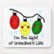 Three Christmas tree bulbs with eyes and a smile in red, green, and yellow and text that reads "I'm the light of Grandma's Life" on holiday tote bags, T-shirts, and other items for kids!