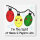Three Christmas tree bulbs with eyes and a smile in red, green, and yellow and text that reads "I'm the light of Nana and Papa's Life" on holiday tote bags, T-shirts, and other items for kids!