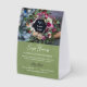 Looking for a way to market your small business and getting your logo and business name seen? Personalize a business tabletop sign with a photo of your beautiful work, your logo and tagline, and what you specialize in or offer at the moment. Add your contact information as well. The text is fully customizable, in white against a light olive green background with a beautiful hand-drawn greenery twig as a simple decoration.
