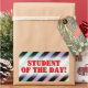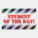 This design features a pattern of stripes coloured various light pastel colours, with black stripes in between them. It also features the message "STUDENT OF THE DAY!".