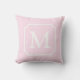 This pillow design has an all over light pink background. In the centre is a white notched square frame with a white monogram initial.