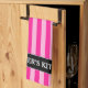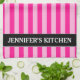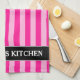 This kitchen towel design features a pattern of alternating light pink and deep pink stripes. It also features a custom name.