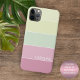 Contemporary pale lime yellow, pastel apple green, and light soft raspberry red pink coloured stripes pattern. With room to customise or personalise with a name, monogram, or initials of your choice. Beautiful, modern, and cool cover for the trend-savvy and art-loving hip trendsetter, artsy motif lover who wants to protect their phone from dust and dirt, wear and tear. This design is available Apple iPhone 6, 7, 8 Plus, 10 or X, XR, XS, 11, 12, 13 Mini, 14, 15 Plus, and Pro Max cellphone cases. Show off your style, look fashionable trendy, and feel stylish with a unique design on a mobile device accessory of your choice.