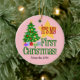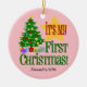 Fun and cute personalised Baby's First Christmas ornamnent. Great for baby girl's first christmas. Add your own headline. Features yellow star, retro fun typeface, colourful presents under the tree, and cute Christmas holiday tree with gold star.