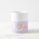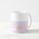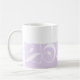 Customisable white mug with a lilac decorative band (Thank You is not customisable). You can easily add and change text (font, size, colour and position) by clicking the customise button. Other models are available.