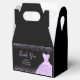A beautiful light purple themed elegant watercolor dress gown on a black background with faux glitter at the top and bottom of the favor box.