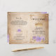 Create your own beautiful, elegant gold and light purple quinceanera programs on a vintage old scroll parchment paper DIY template. It's easy to add in personalised event details with the ample space this folded sheet provides. The unique watercolor floral art by Raphaela Wilson spotlights lavender roses with faux metallic gold accents, a royal princess crown / tiara, sparkle confetti glitter butterflies, as well as luxurious filigree borders. While the chic typography in the example shows calligraphy script and modern fonts, feel free to edit the style. The worn parchment sheet of paper is designed to be folded over in half, and not only complements a lilac and gold themed rustic ranchera quince beautifully, but also a Mexican sweet 16 birthday party. Reword them for elegant wedding programs, among other special events where this once upon a time vintage fairytale design is called for. Add custom details such as names, location, date, mass ceremony, order of service, the honoured party of chambelanes / damas, plus a personalised thank you message. If you would prefer to keep the text at a minimum, there's room for a glamourous Mis Quince Anos picture / photo. Your personalised light purple and gold quince program can be held onto to serve as a cherished keepsake long after the celebration has passed. Enjoy! Category: traditional folded quinceañera program schedule / XV template ideas; fairy tale princess wedding program with butterfly confetti; and lavender watercolor wedding programs. Gold and lavender quince theme colours: dusty light purple, lavender, pale lilac, pastel violet, tan, soft brown, yellow champagne gold, black and white.