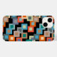This phone case has a geometric design of squares inside squares in lighter shades of blue, teal, orange, tan, off-white, mango, and grey on a field of black.