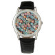 This men's watch has a geometric design of squares inside squares in lighter shades of blue, teal, orange, tan, off-white, mango, and grey on a field of black.