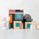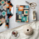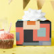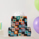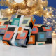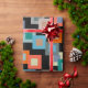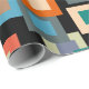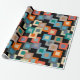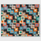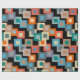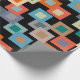 This wrapping paper has a geometric design of squares inside squares in lighter shades of blue, teal, orange, tan, off-white, mango, and grey on a field of black.