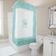 Light teal blue damask pattern, frame and monogram shower curtain