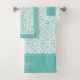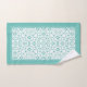 Light teal blue and white damask pattern and scalloped borders Bath Towel Set. The bath towel features an elegant light teal blue and white damask pattern and bands on the short sides with scalloped edges. There is also a frame with your family name. The hand towel showcases a scalloped border around it while the wash cloth is in blue in the centre with a damask border and your monogram. You can personalise it with your family name and monogram.