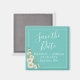 Pretty square Save the Date magnet features watercolor white daisies corner on light teal background with white customisable text blocks in modern fonts