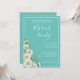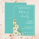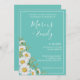Pretty casual wedding invitation design features watercolor white daisies corner on light teal background with white customisable text blocks in modern fonts