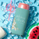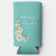 Pretty wedding seltzer can cooler features watercolor white daisies corner on light teal background with white customisable text blocks in modern fonts