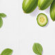A light vegetable pattern of fresh whole and sliced cucumbers with green leaves on a white background.