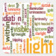 This artwork centres on the word "light" rendered in large, bold letters. Surrounding this focal point are numerous related words, arranged in varying sizes and orientations, filling the frame and creating a dense, visually interesting composition. The arrangement of words forms a lively word cloud, emphasizing the central theme of light.
