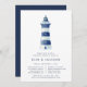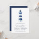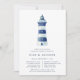 Our coastal chic rehearsal dinner invitations feature a blue and white watercolor lighthouse illustration, with your ceremony rehearsal and dinner details beneath in navy blue lettering. Invitations reverse to solid nautical navy blue.
