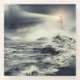 This photo features a lighthouse beacon shining with stormy weather and crashing waves.