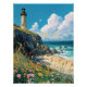 A classic lighthouse stands firm on a rocky outcrop, watching over the gentle waves of the ocean. The beach stretches endlessly, framed by tall grasses and wildflowers, creating a timeless coastal scene. A soft blue sky, dotted with a few fluffy clouds, complements the serene beauty of the landscape. This tranquil seascape captures the quiet power of the coast and the calm it brings.