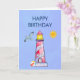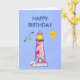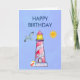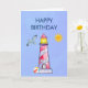 A birthday card with a nautical theme. Designed on a lavender purple background with a red striped lighthouse. A smiling sun and flying seagull off in the ditance. With a fun beach ball at the base of the building. Message on the inside which you can personalise or leave as is.