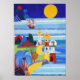 This is a painting by Jean Tori of Leo the Falcon's ship sailing toward Green Island from the children's book, "Leo's Birthday Adventure". The island, that is bursting with color, has three lighthouses to guide the incoming ship traveling over the rolling waves. A big yellow moon sits in the background, with volcanos spewing lava in red and blue.