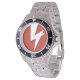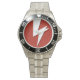 Has heft and feel of expensive stainless steel quartz watches. Good band with safety catch. I removed links, which is easy because engraved arrows show direction to push the linking pins. As always by this seller, the image (a railroad logo) is a perfect reproduction of my emailed image, and is precisely spaced and aligned.