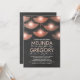 Chalkboard wedding invitation with pink upside down umbrellas with lighting inside.