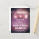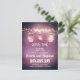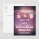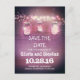Rustic wooden background save the date postcard with purple hanging lights mason jars.