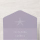 This wedding design is a perfect blend of elegance and beachy vibes. The main feature of the design is a small white starfish motif that sits gracefully in the centre of the lavender coloured background. The starfish motif is intricately designed and adds a touch of nature to the invitation. The typography used is classic white, which adds a touch of sophistication and ensures that the text is easy to read. The font style used is clean and modern, creating a timeless look that will never go out of fashion.