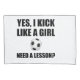 Female soccer players, women coaches, teams and fans of the sport joke yes, I kick like a girl. Need a lesson? Check out this funny custom design on tees, shirts, mugs, cases, gifts and apparel.